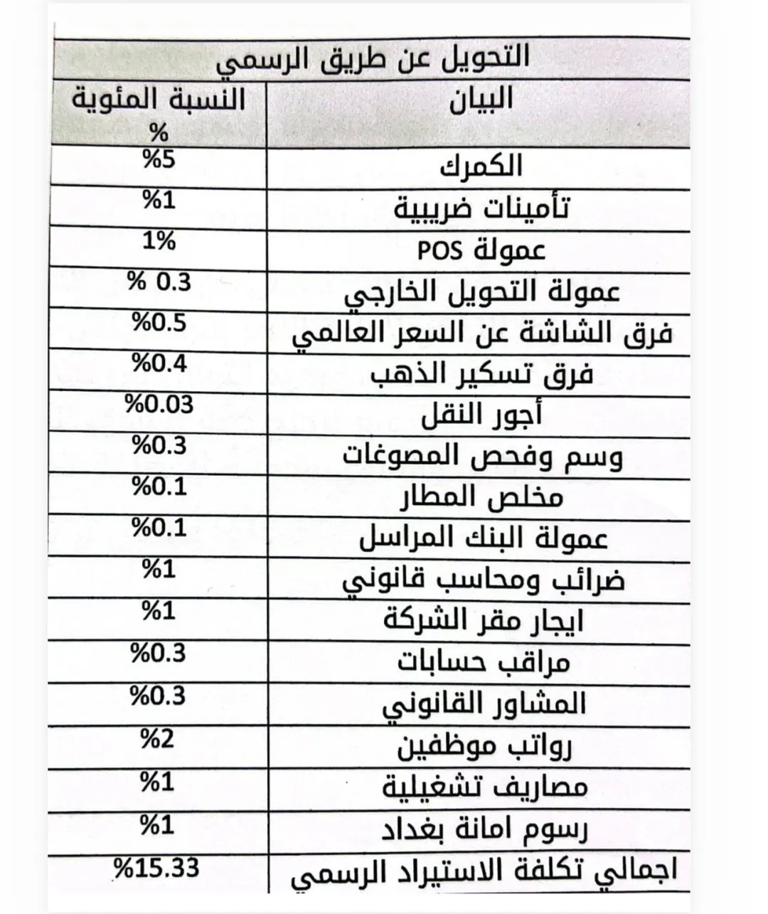 في غضون ذلك، يقول علي العكيلي، وهو تاجر ذهب عراقي، لوكالة شفق نيوز، إن "الإشكالية الجوهرية تكمن في اعتماد نسبة 5% خصوصاً وأنها تُستوفى من رأس المال وليس من الأجور أو الخدمات، وهو ما يعد غير منطقي، كون الذهب ليس سلعة استهلاكية بل معدناً نقدياً ذا سعر عالمي ثابت"، لافتاً إلى أن "سعر الأونصة عالمي ولا يخضع للتسعير المحلي".