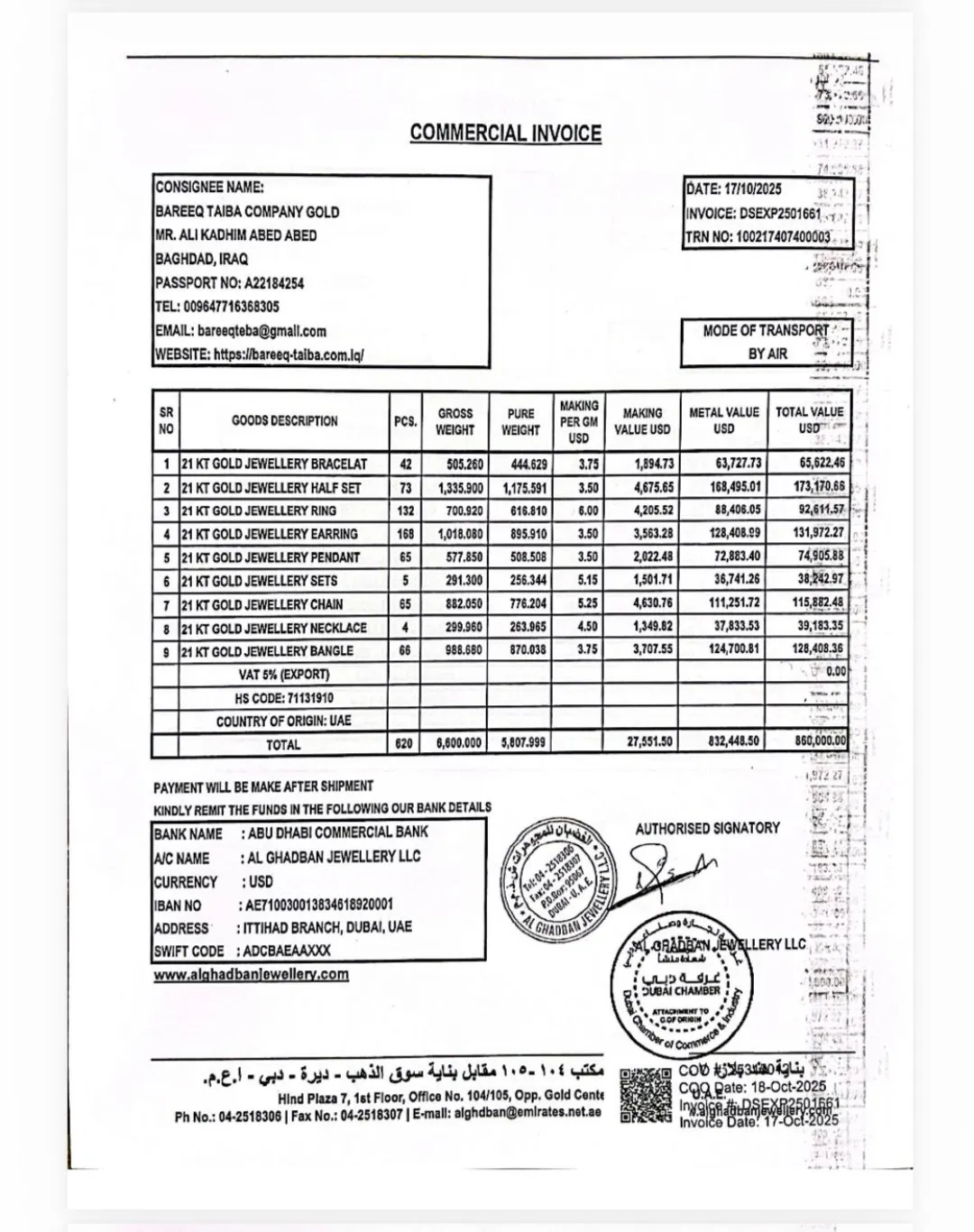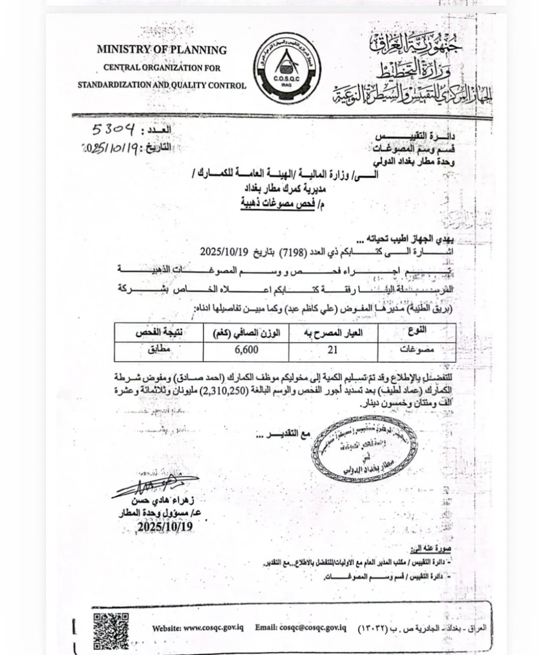 كما يضيف العكيلي أن استيراد الذهب متوقف منذ 1 كانون الثاني/ يناير 2026 في جميع مطارات العراق، كاشفاً عن وجود شحنات ذهب عالقة في مطار بغداد الدولي منذ أكثر من 18 يوماً، بسبب عدم وضوح التعليمات الجمركية وتباين التفسيرات بين الجهات المختصة.