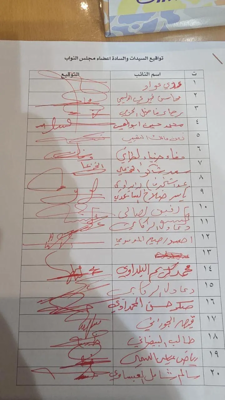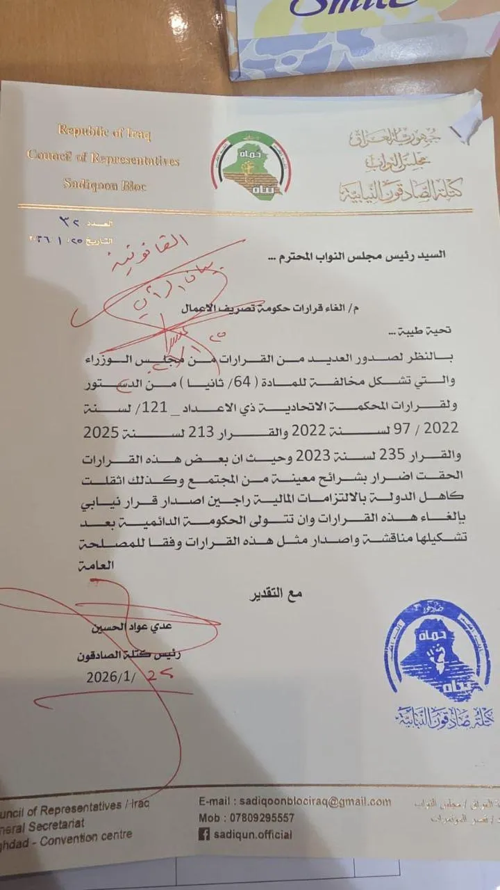 بدوره وجّه رئيس كتلة "صادقون" النيابية، عدي عواد الحسين، كتاباً رسمياً إلى رئاسة مجلس النواب دعا فيه إلى إلغاء قرارات حكومية صادرة خلال فترة تصريف الأعمال، معتبراً أنها مخالفة للدستور والقوانين النافذة.