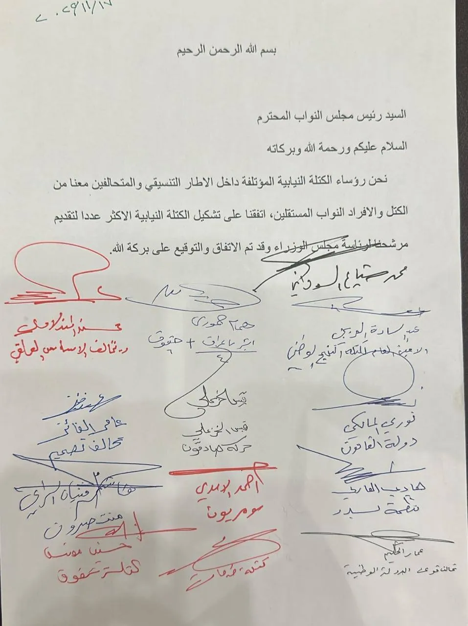 الإطار التنسيقي يقدم نفسه "الكتلة الأكبر" لهيبت الحلبوسي (وثيقة)