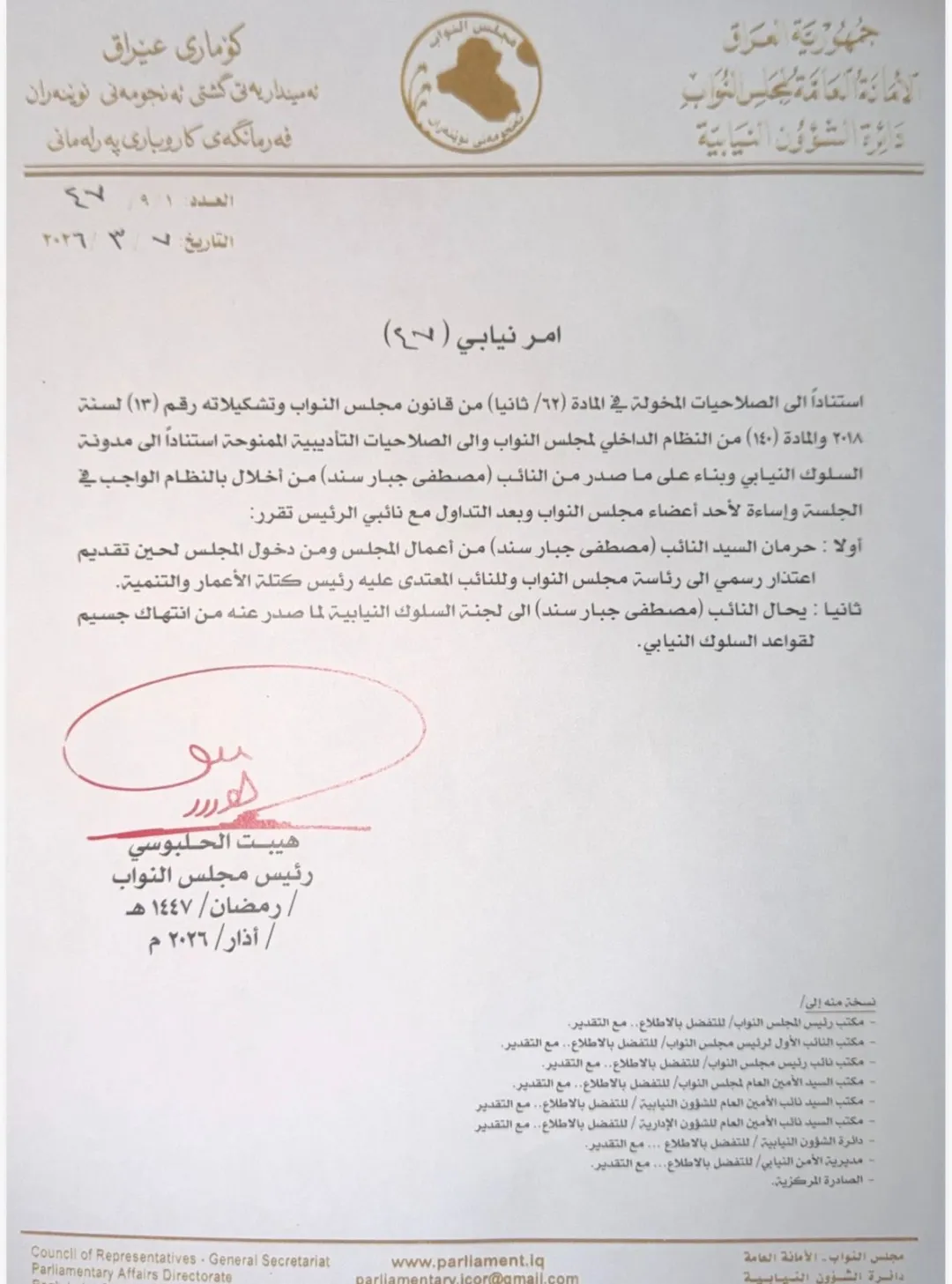 أصدر رئيس مجلس النواب العراقي هيبت الحلبوسي، يوم السبت، أمراً نيابياً بحرمان النائب مصطفى جبار سند من حضور جلسات المجلس مؤقتاً، وإحالته إلى لجنة السلوك النيابي.