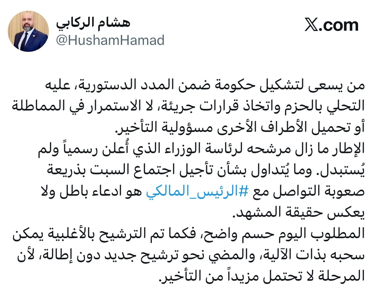 وقال الركابي في تدوينة على موقع "إكس"، إن "من يسعى لتشكيل حكومة ضمن المدد الدستورية، عليه التحلي بالحزم واتخاذ قرارات جريئة، لا الاستمرار في المماطلة أو تحميل الأطراف الأخرى مسؤولية التأخير"، في إشارة واضحة إلى إخفاق الإطار في تسمية مرشحه لمنصب رئيس مجلس الوزراء لغاية الآن رغم انتخاب البرلمان رئيس الجمهورية الجديد نزار ئاميدي.