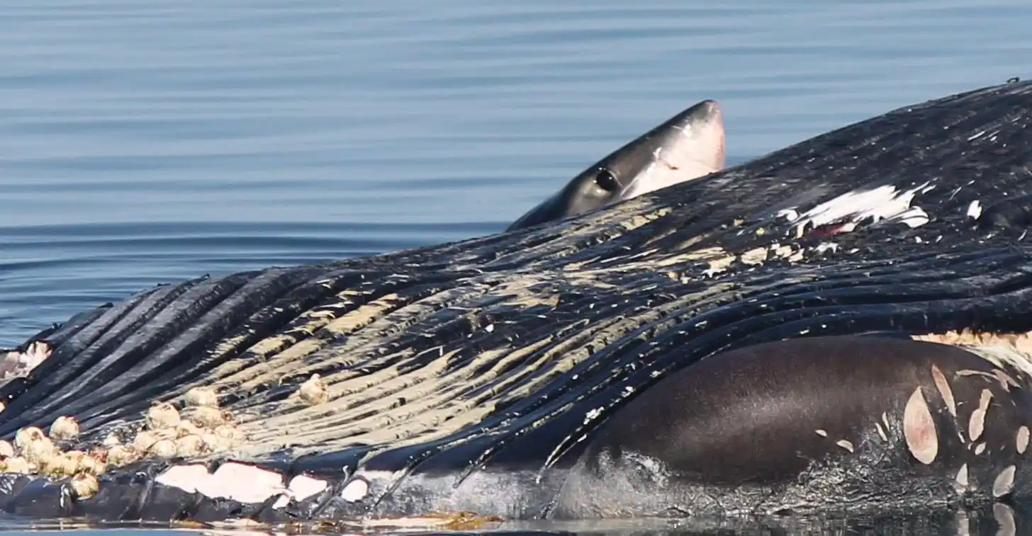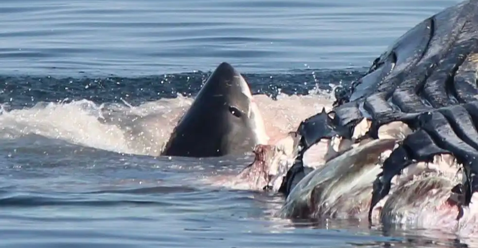أبيض كبير وهو يفترس حوتاً أحدب.
