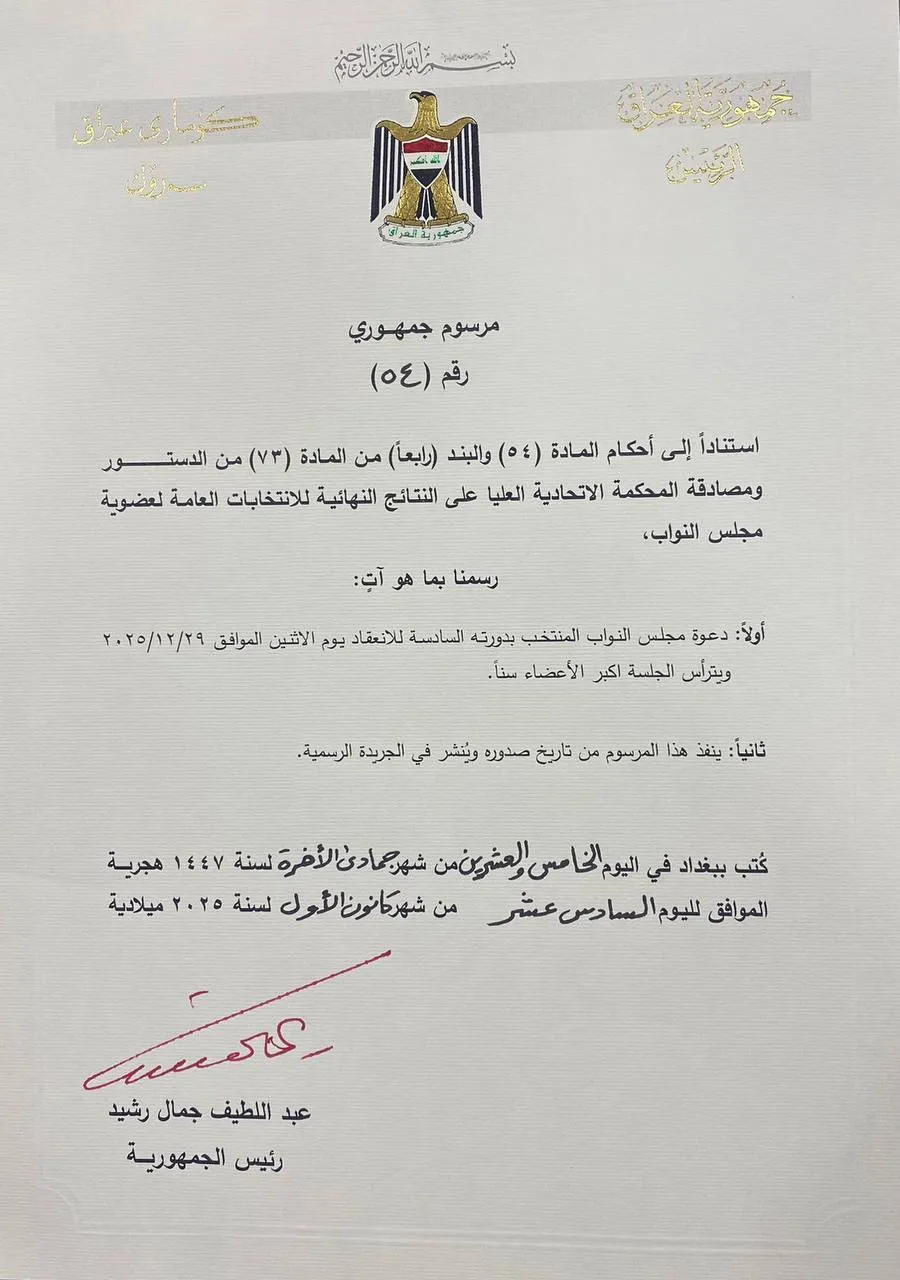 وأضافت الوثيقة، أنه "بناءً على مصادقة المحكمة الاتحادية العليا على النتائج النهائية للانتخابات العامة لعضوية مجلس النواب، تقرر دعوة المجلس إلى الانعقاد يوم الاثنين الموافق 29 كانون الأول/ديسمبر 2025".