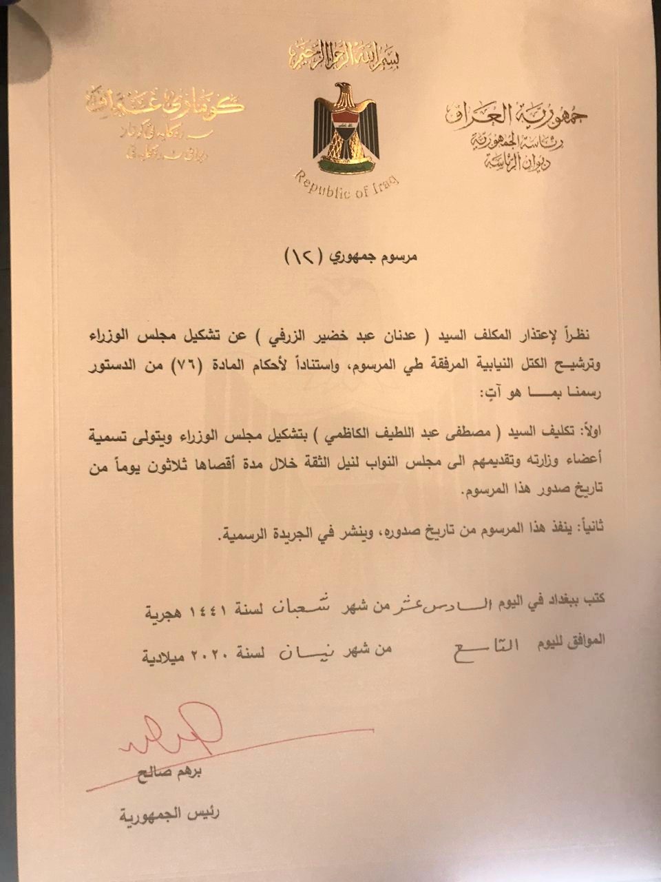 Shafaq News / President of the Republic , Barham Salih signed on Thursday, a letter mandating Mustafa Al-Kathemi to form the new government.
