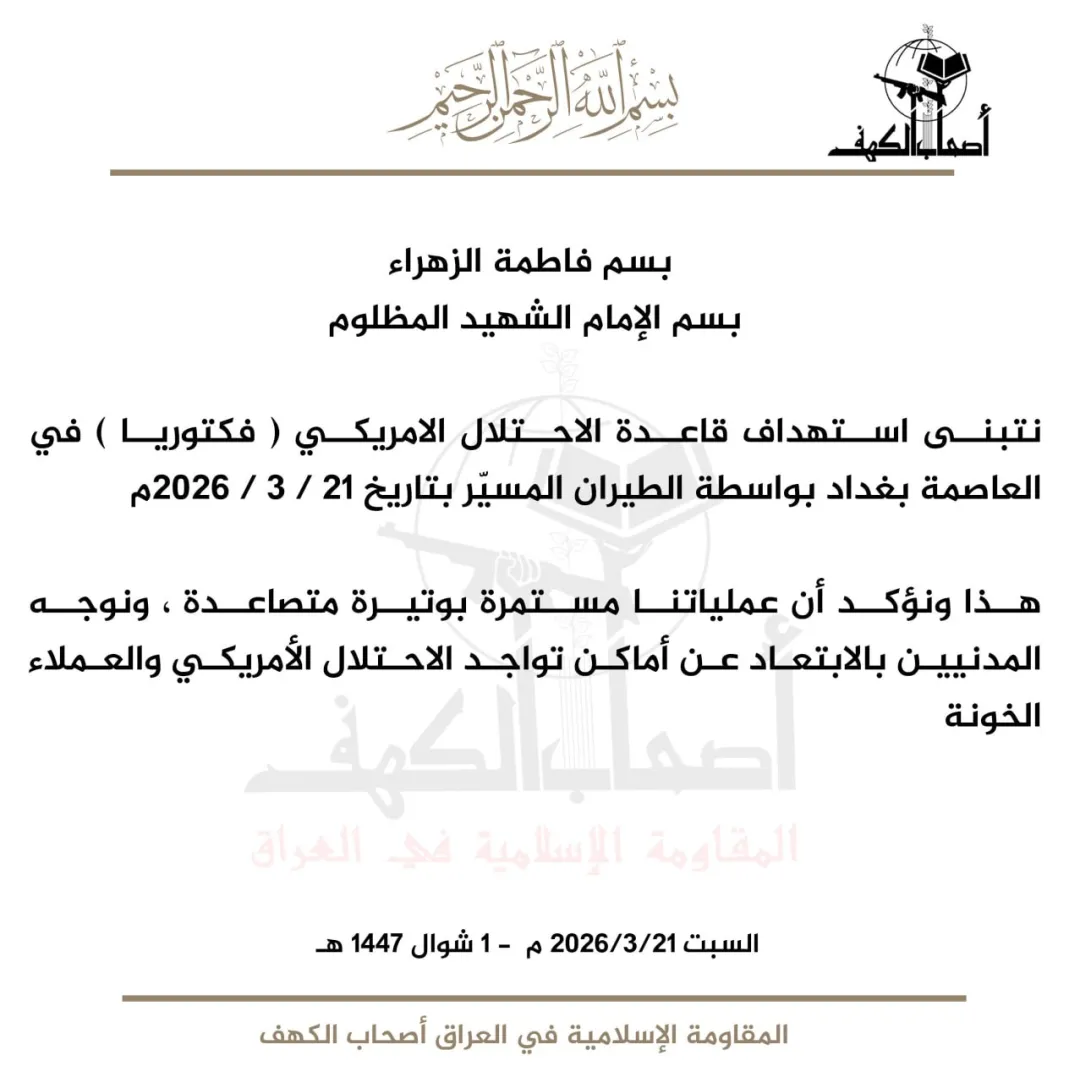 In a statement, the group said it struck what it described as the “Victoria base” in Baghdad using a drone and warned civilians to stay away from areas hosting US forces.