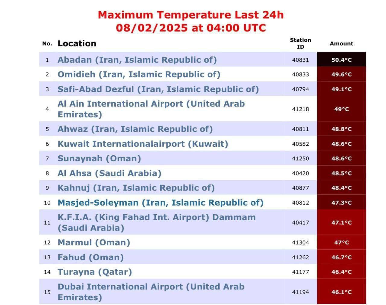 وەگورەی راپۆرت ویستگەی "پلاي ويزەر" جیهانی کە پەیوەندیدارە وە کەشناسی، ناوچەی عەبادان لە ئیران لە نوای لیستەگە بوی وە 50.4 پلەی سەدی، ئیجا عەمیدیە لە ئیران وە 49.6 پلەی سەدی، ئیجا سەفی ئاباد دیزەفول لە ئیران وە 49.1 پلەی سەدی.